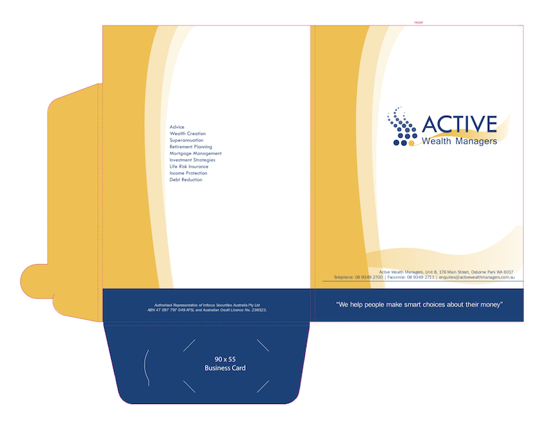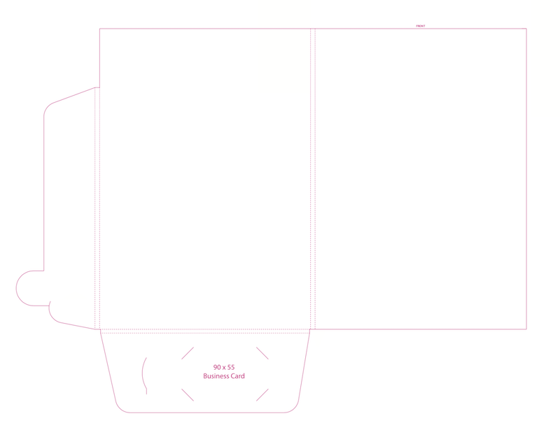 Presentation Folders, printed on 360gsm Gloss CARD, full colour, outside only and die-cut to shape (pictured as per template and samples above)